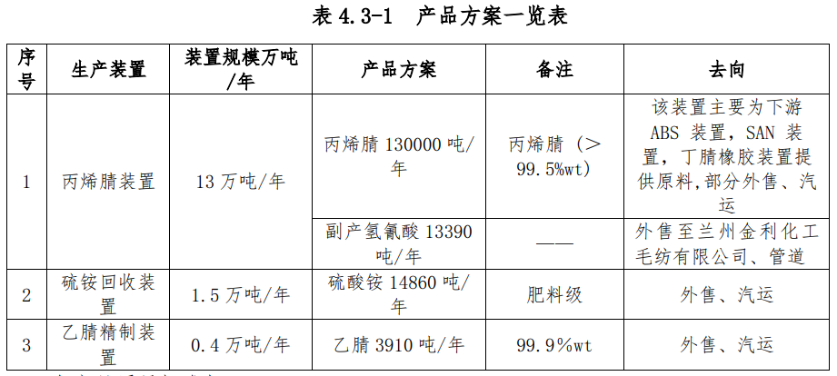 本项目主产品为丙烯腈,副产品为精乙腈、硫铵和氢氰酸,扩建的丙烯腈装置工艺技术仍采用丙烯、氨氧化法工艺,其主要产品为丙烯腈成品,同时副产精乙腈、硫铵化肥。丙烯腈装置,包括副产品装置的产品及产量如下: